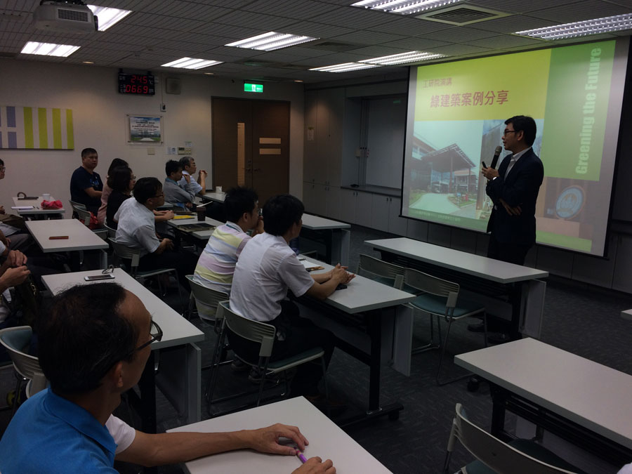 工研院從2011年起積極推動綠色低碳院區計畫「Green Campus」,為了展開一系列節能減碳工作,邀請多位專家學者進行院內演講。在本次講座中,陳理事長與工研院同仁們交流分享他親自參與輔導執行的綠建築案例經驗,以及案例執行中的一些小故事,讓大家了解如何從不同面向執行一個綠建築專案。
