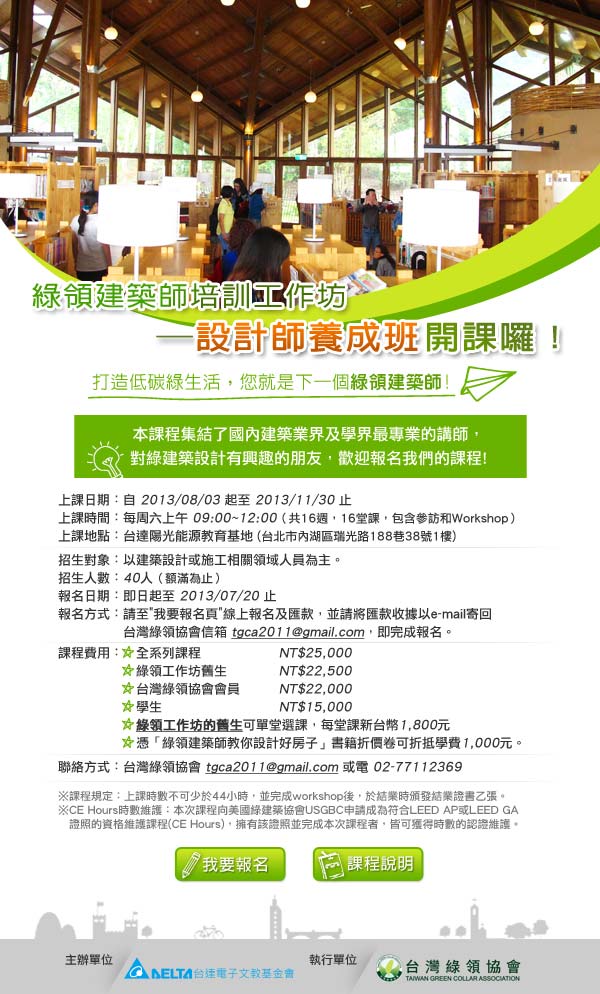 協會和台達電子文教基金會共同合辦的「綠領建築師培訓工作坊-第5屆設計養成班」開始報名囉!!