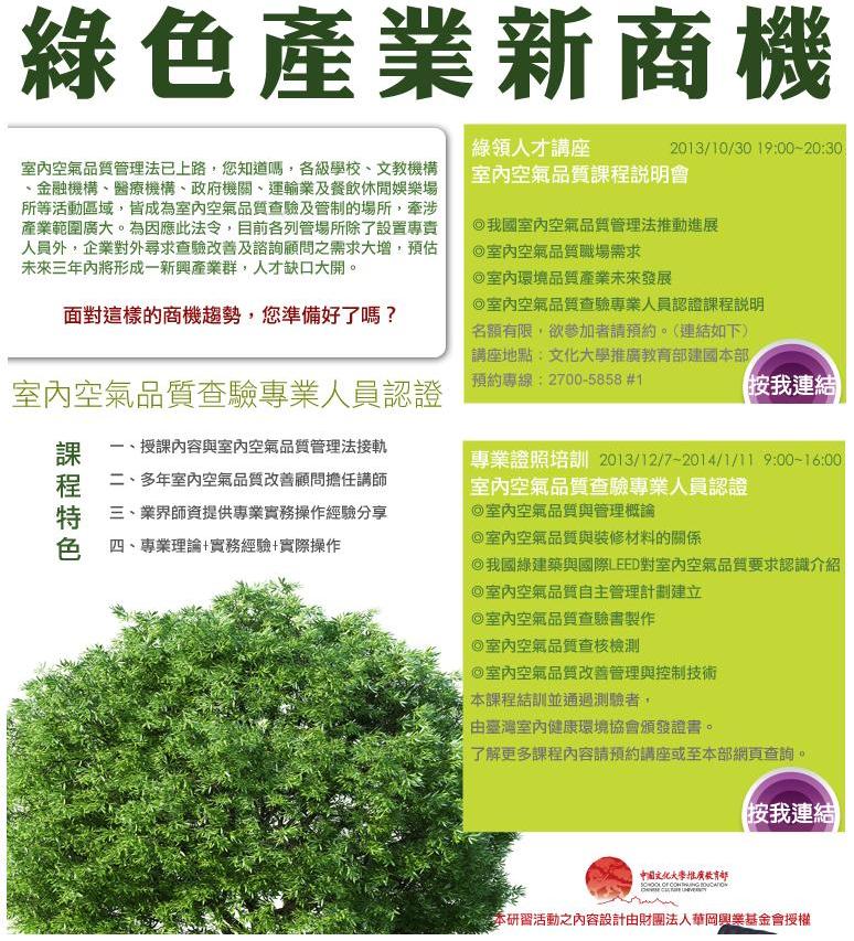 由中國文化大學推廣教育部、台灣綠領協會及台灣室內健康環境協會共同舉辦之第一屆「室內空氣品質查驗專業人員認證」將於12月7日(六)正式開課!