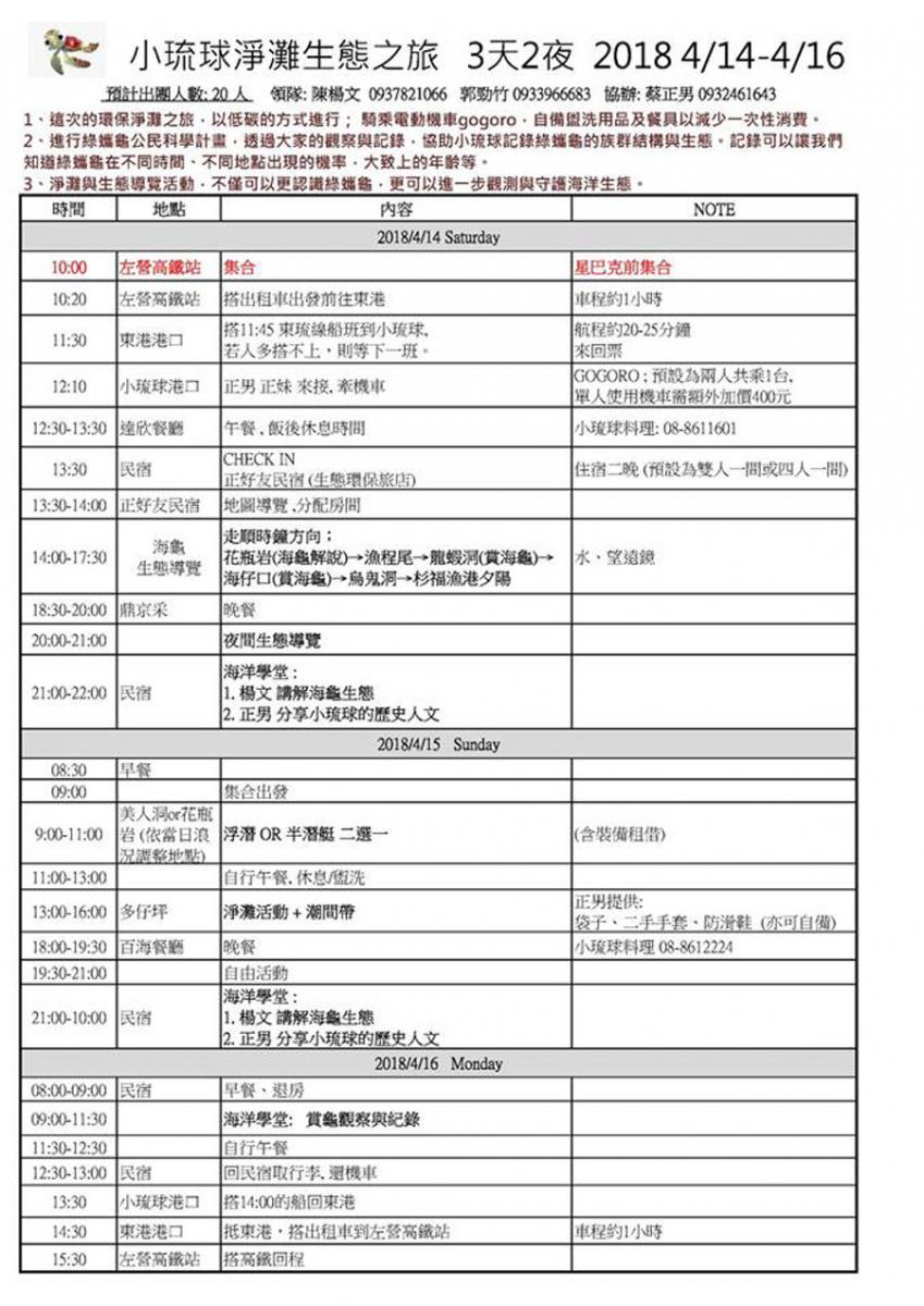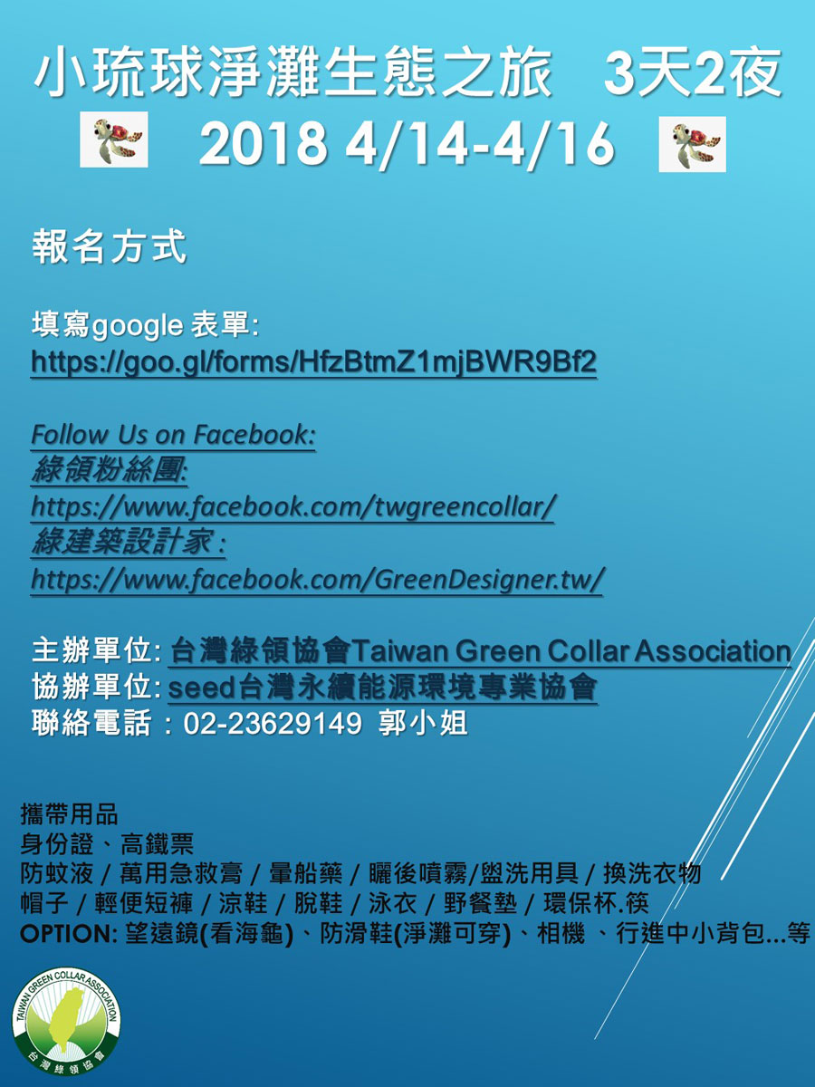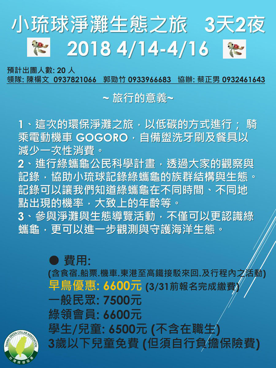 小琉球的海龜生態可說是世界上島嶼中最大的盛況,這次活動除了由海洋學家‧同時也是台灣綠領協會理事長 陳楊文來帶潮間帶生態 外,並也找到小琉球當地得獎永續民宿的正好友主人 蔡正男先生操刀,這種組合是歷經多年的磨合才有的默契。目前營隊還有名額,您家如有小學學童,真的可以考慮參與,在夏季人潮湧入前到小琉球,因為現在春天才是海龜潮湧入小琉球的最佳時刻。